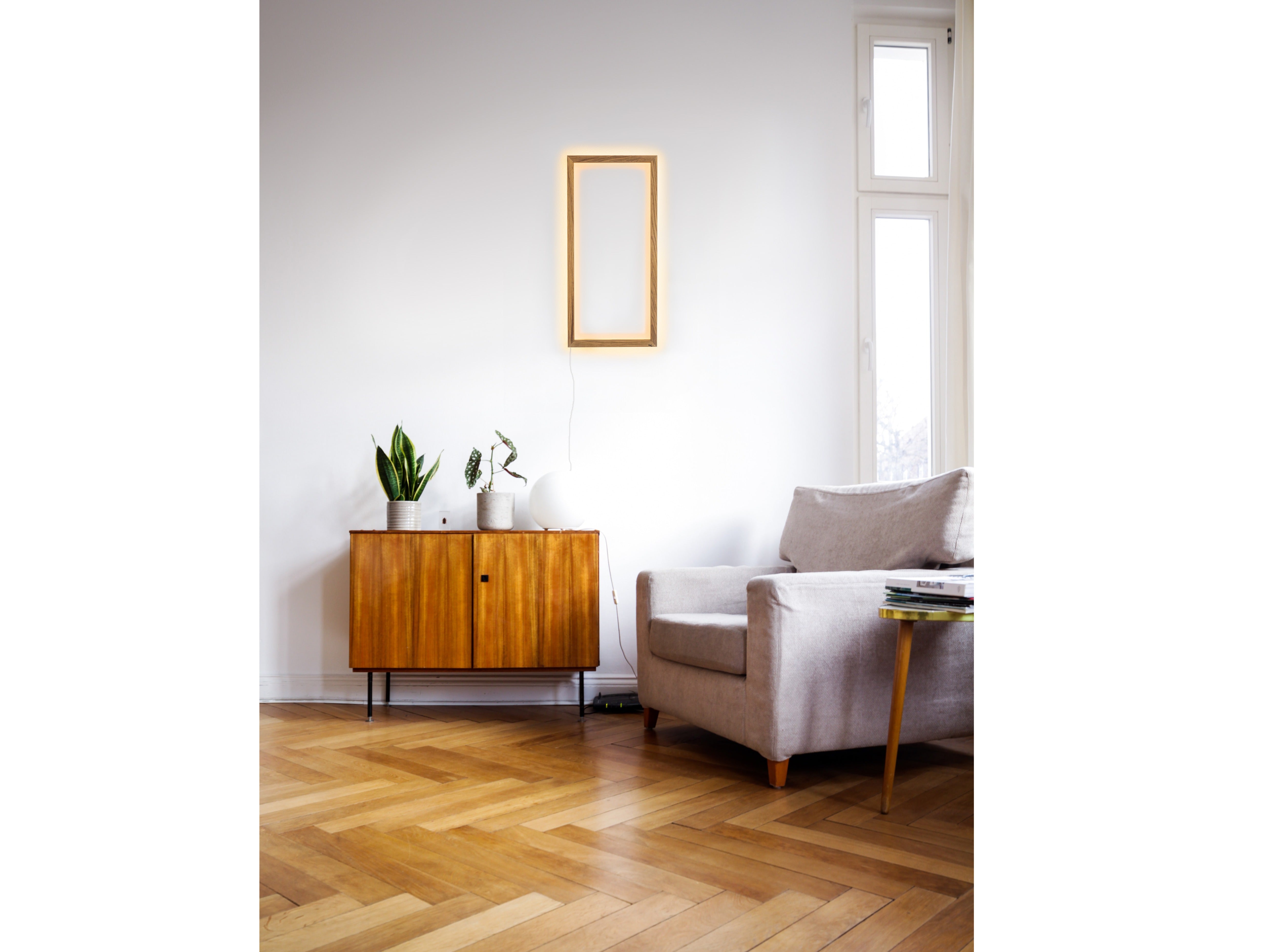 Die Kombination aus geöltem Eichenholz, minimalistischem Design und moderner Technik machen es zu einem Highlight im Raum.